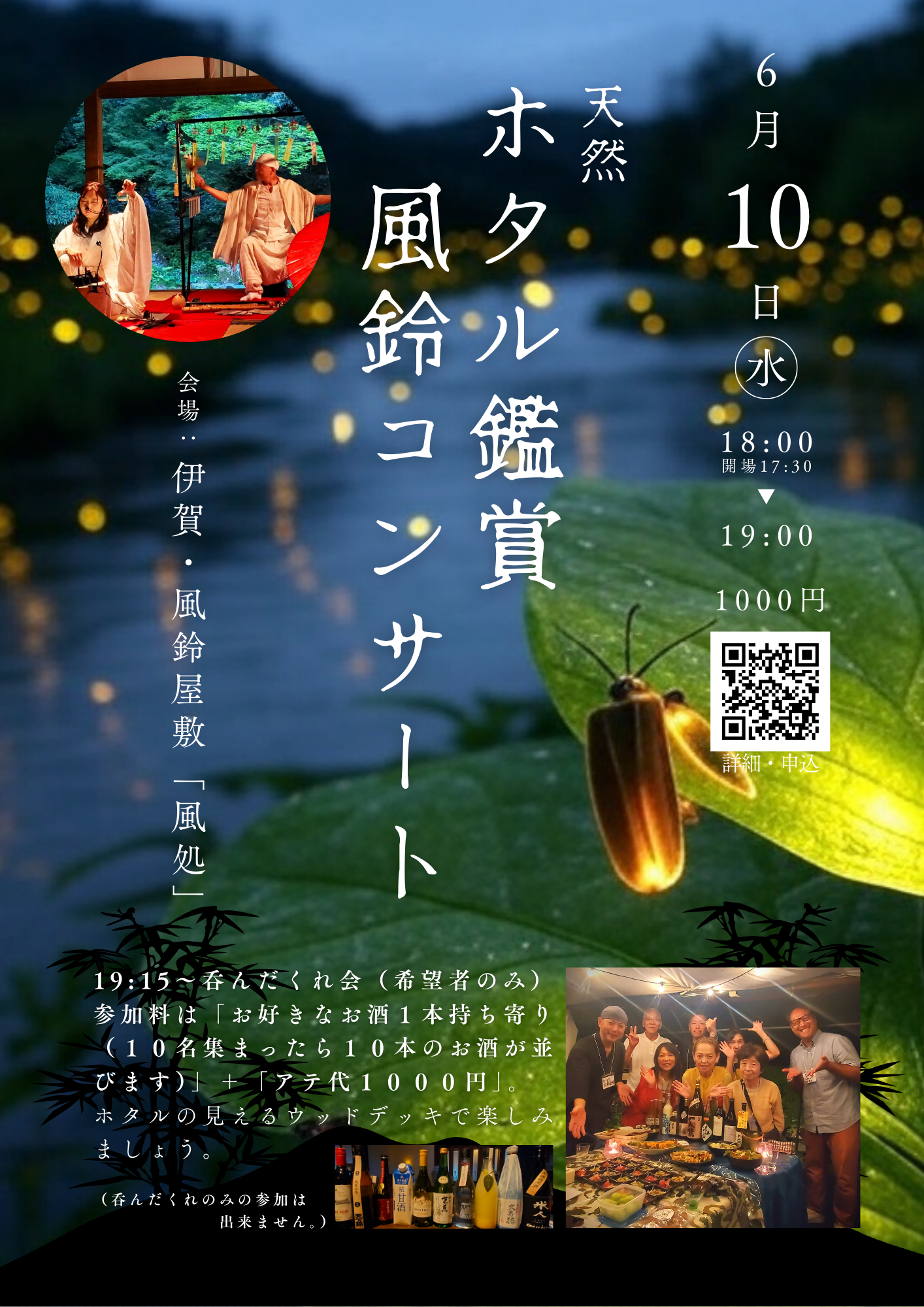 内容 30個の風鈴と尺八・琴による演奏、150個の風鈴展示見学、ホタル観賞、希望者は呑んだくれ交流会